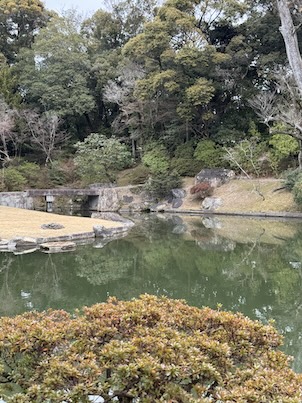 仙洞御所は上皇のお住まいを指すそうで、1854年の大火による消失後は多くの建物は再建されずに今に至るそうで、仙洞御所の見学といっても庭の見学なのです。御常御殿は現存しており手入れされ、外に面する部分だけは障子ではなくガラスの扉が仕立てられておりました。エリザベス女王やダイアナ妃が滞在されたそうです。現在は隣接する場所に新たに迎賓館が建てられ、最近の賓客はそちらに滞在されるそうです。庭は南北二つの池をぐるりと回る回遊式庭園で茶室が点在しております。京都の中心にありながら庭を巡ってどこを眺めても高い建物や電柱などの人工物は全く見えません。本当に広い場所に素晴らしい造園で、小堀遠州作の庭園の一部が残っていたり、橋や生垣などにも独特の意匠が施されておりつくづく手の込んだつくりであることを実感いたしました。